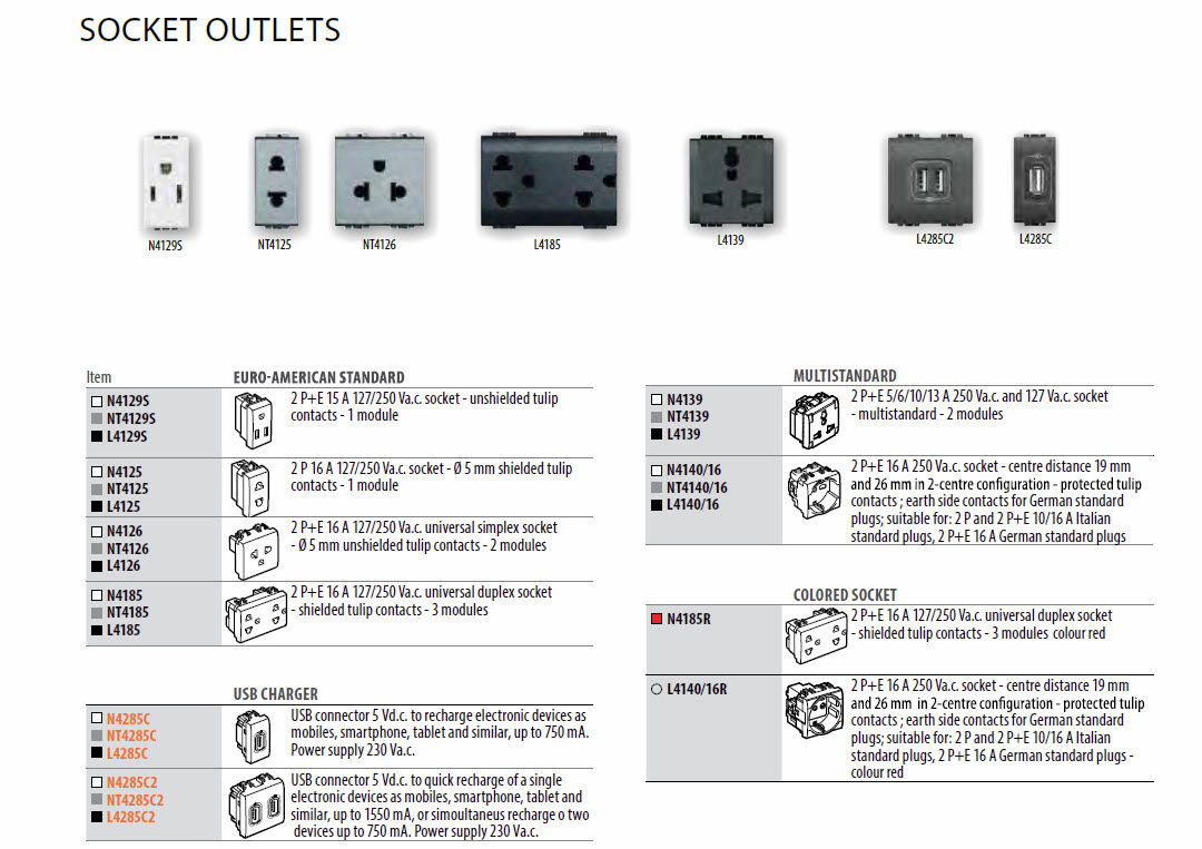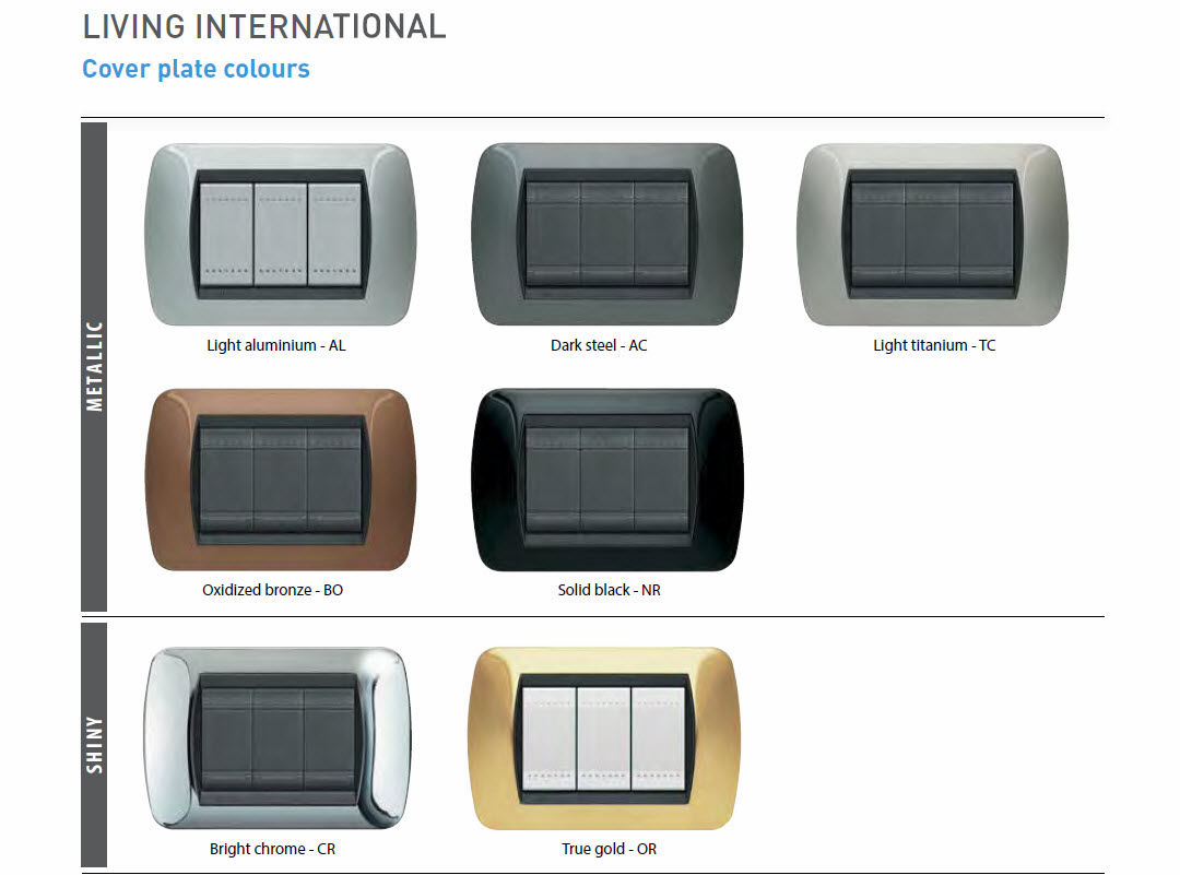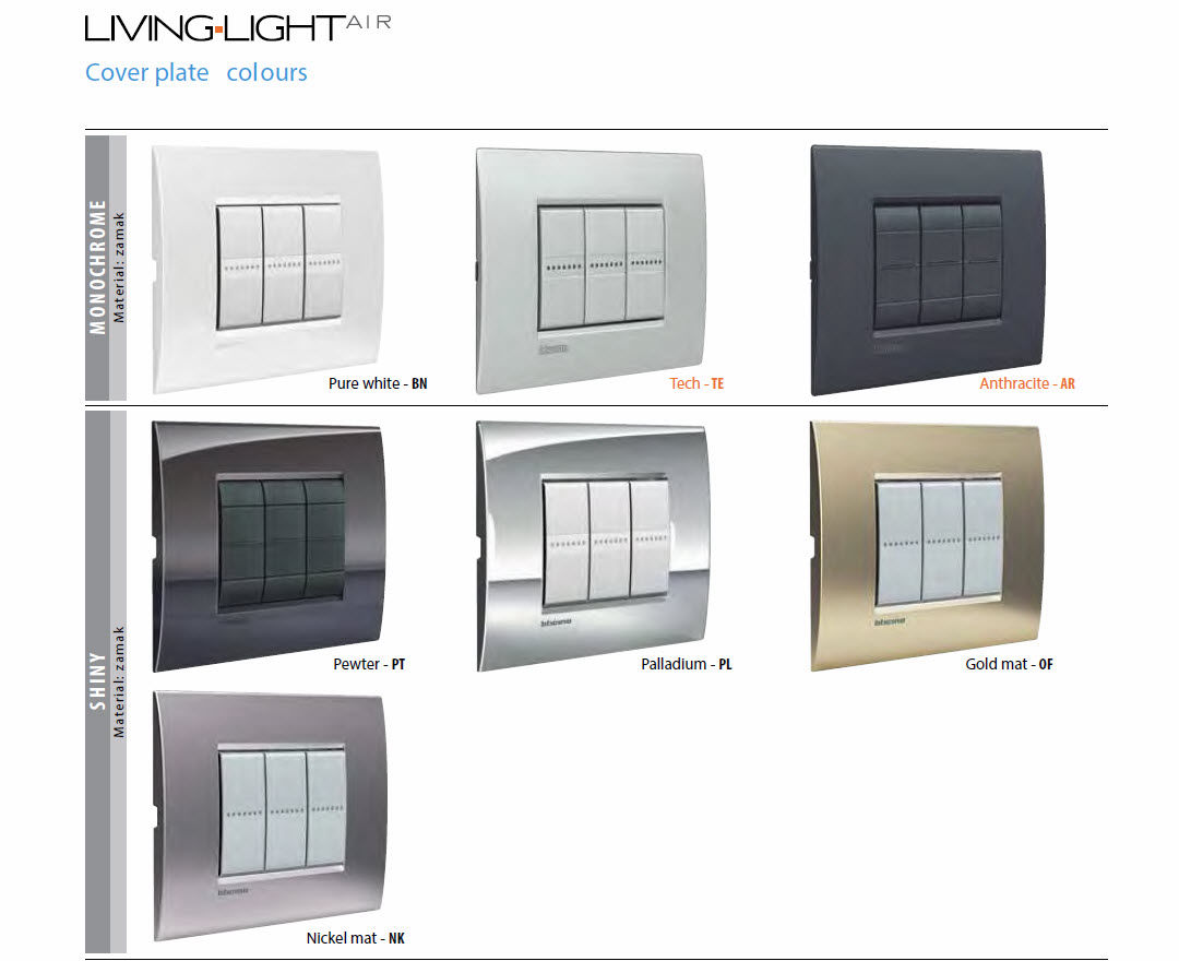 * Square Cover plates: the Livinglight square plates are timeless classics which keep up to date with the most contemporary design. BTicino proposes plastic, solid wood and die-cast metal finishes;